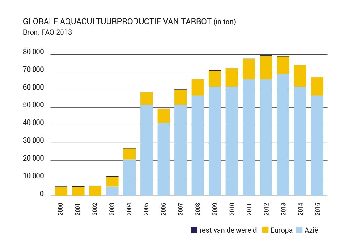 ➜ De wereldproductie van gekweekte tarbot overtreft die van de visserij op de wilde soort.